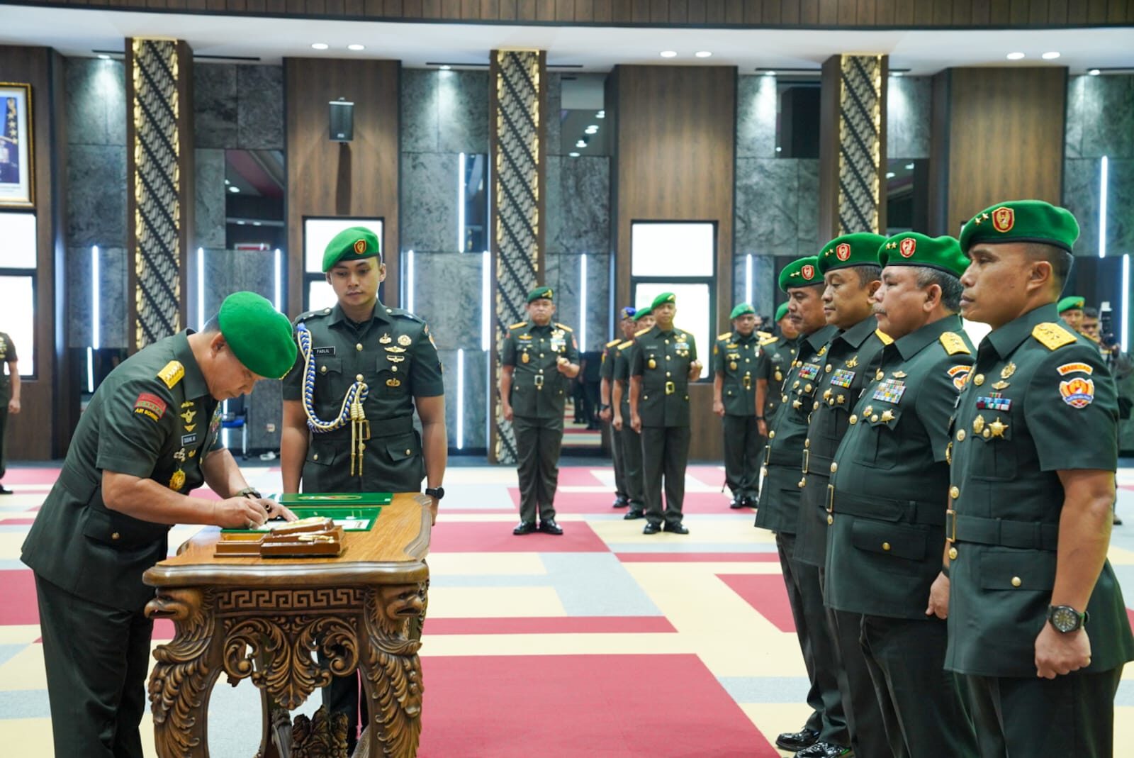 Kepala Staf Angkatan Darat (Kasad) Jenderal TNI Dr. Dudung Abdurachman memimpin acara Serah Terima Jabatan (Sertijab) Asisten Intelijen (Asintel) Kasad dari Mayjen TNI Dedi Solihin, Kepada Mayjen TNI Dr. Drs. Arief Jaka Tandang, M.C.S., M.A.P. dan Asisten Logistik (Aslog) Kasad dari Mayjen TNI Saiful Rachiman, kepada Mayjen TNI Hari Arif Wibowo, S.I.P., M.Han bertempat di gedung AH Nasution Mabesad Selasa (28/2/2023).