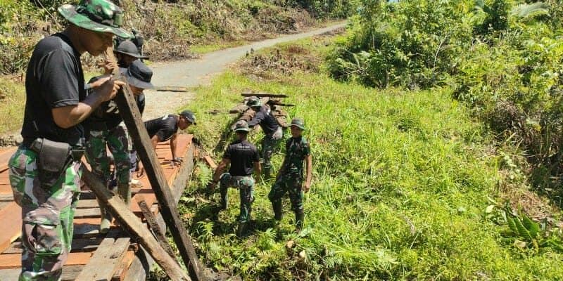 Bentuk kepedulian terhadap lingkungan dan pembangunan di Papua terutama perbatasan RI-PNG, Satgas Pamtas RI-PNG Yonif 711/Rks Brigif 22/OM melalui Pos Kaliasin bersama warga bahu membahu membangun jembatan sebagai jalan utama penopang ekonori di Kampung Kibay, Distrik Arso Timur, Kab. Keerom, Papua, Minggu (9/10/2022).