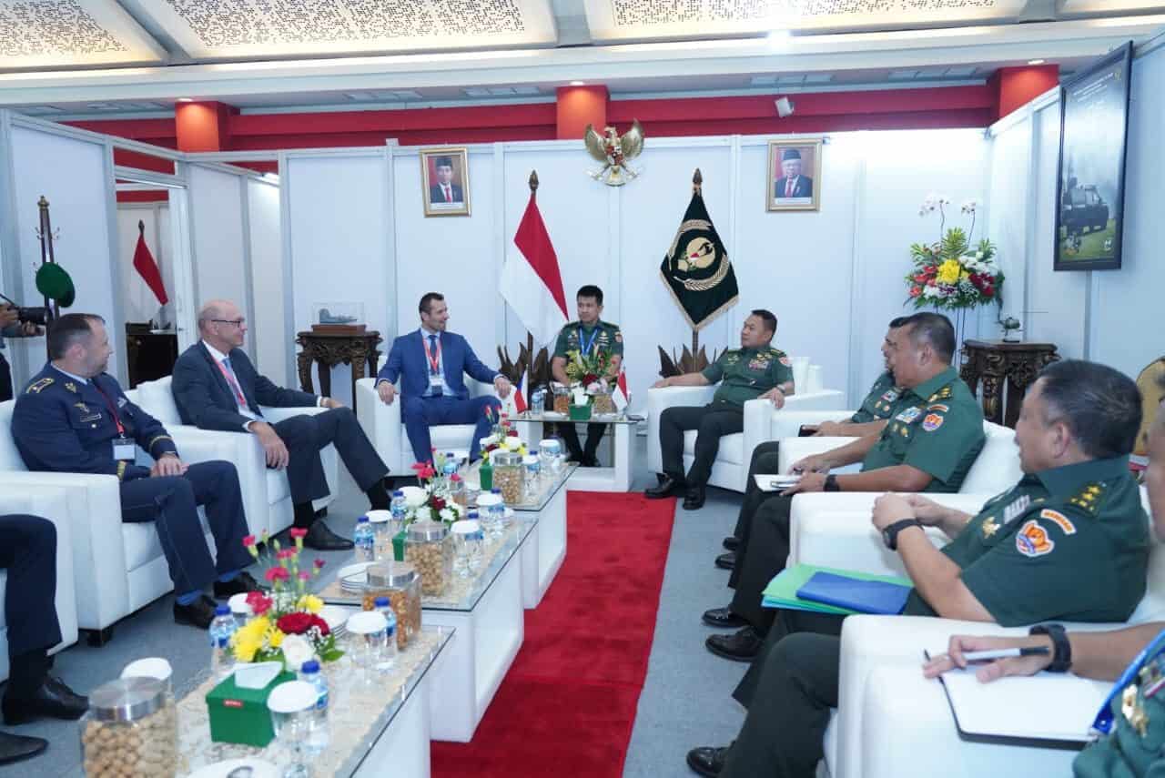 Pada kesempatan pembukaan pameran ini, Kasad Jenderal TNI Dr. Dudung Abdurachman menerima Courtesy Call dari Deputy Minister of Defense of the Czech Republic H.E. Mr. Daniel Blažkovec dan CEO Korea Aerospace Industries LTD, Kang Goo Young di Hall B JIExpo Kemayoran.